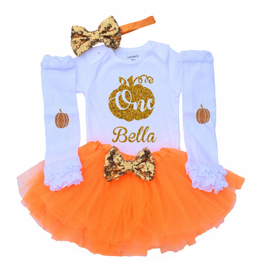 Pumpkin 1st Birthday Outfit Girl, Fall Birthday Outfit, Glittering Gold Pumpkin One