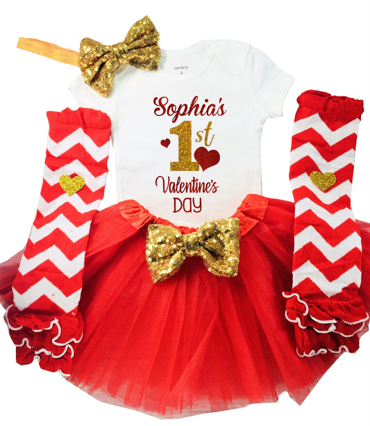 1st Valentine's Day Personalized Baby Girl Outfit (Gold and Red)